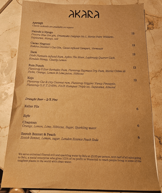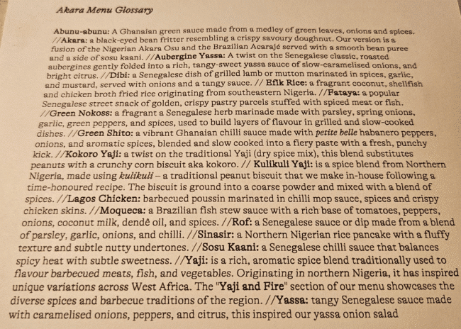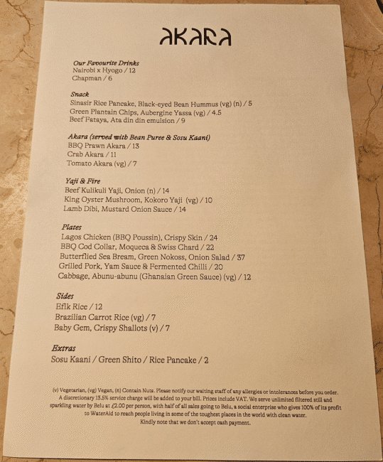 חצי שנה אחרי שהרבצנו ארוחה מסקרנן ונהדרת באקוקו, אחת מאותן שלוש מסעדות מישלן אפריקאיות, חגגנו יום נישואין במסעדת האחות שלה, Akara, מסעדה חדשה יחסית שנפתחה באזור שוק בורו, ונקראת על שם מאכל פופולרי בשם הזה – מעין לביבות שעשויות ממחית שעועית ונפוצות בעיקר במערב אפריקה, אבל פופולריות גם בברזיל.